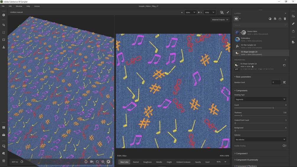 ES-Shape generates shapes into Substance 3D hosts, Painter, Sampler, Designer, but also third party hosts such as Blender. With a uniform interface across hosts, design simple or complex shapes and integrate them with the own functionalities of the host.