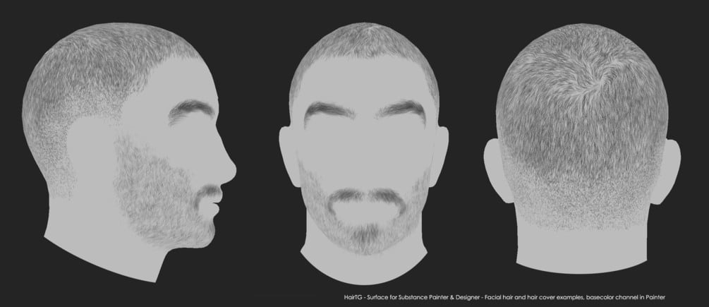 HairTG-Surface Pro is a hair/fur texture generator for Substance 3D Painter and Designer. It contains both HairTG-Surface and HairTG-Facial Hair as well as components to create your own facial hair designs and custom generators with Substance 3D Designer.